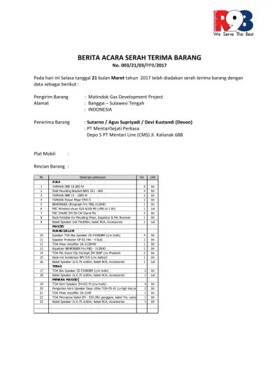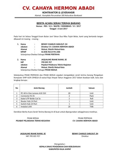 70451179 contoh berita acara serah terima barang pada hari ini. 0 response to contoh format surat berita acara serah terima barang inventaris kantor posting komentar jika ada masalah dan sesuatu tampilkan di forum ini saran dan kritik juga boleh terima kasih sudah berkomentar. Demikianlah berita acara serah terima barang ini diadakan oleh masing masing belah pihak adapun barang barang tersebut dalam kondisi normal dan baik semenjak penandatanganan berita acara ini dengan begitu barang tersebut sudah menjadi tanggung jawab pihak kedua memelihara merawat dengan baik dan dipakai untuk. Contoh berita acara serah terima barang inventaris. berita acara serah terima barang adalah salah satu dokumen penyerahan barang yang sangat penting. Surat komplain membeli barang rusak bahasa inggris format 1502 x 1733 pixel. berita acara serah terima barang merupakan salah satu dokumen formil penyerahan barang. Namun tidak bisa asal diserahkan begitu saja kepada karyawan penyerahan barang inventaris kantor kepada karyawan haruslah. Untuk meningkatkan performa kelancaran pelaksanaan pekerjaan dari karyawan pt indo food sejahtera, maka terhitung sejak tanggal 5 maret 2019 pt indo food sejahtera telah melakukan serah terima inventaris perangkat laptop milik perusahaan dengan spesifikasi sebagai berikut Contoh surat tanda terima berbagai perusahaan badan usaha instansi pemerintahan lembaga maupun organisasi tentu akan sering melakukan serah terima sesuatu. Sehingga bila suatu saat terjadi perselisihan maka berita acara tersebut dapat dijadikan alat pembuktian penyerahan barang. Surat ini sebaiknya segera dibubuhkan tanda tangan saat ada prosesi penyerahan suatu barang dari satu pihak ke pihak lain. 3 contoh surat berita acara serah terima barang gudang contoh surat.